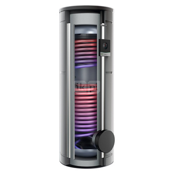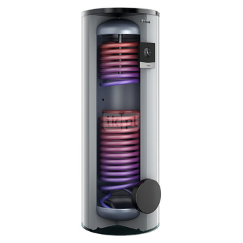 VIH S2 350/4B, stojący okrągły o pojemności 350litrów, wyposażony w dwie wężownice do pracyw układach solarnych z grupami pomp