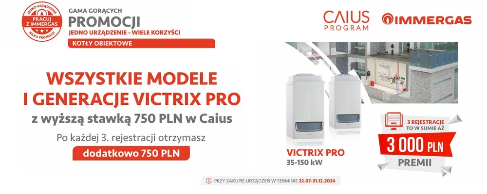 Każda trzecia rejestracja dowolnego modelu i generacji kotła VICTRIX PRO od IMMERGAS w Programie Caius nagradzana jest dodatkową premią wysokości 750 zł!